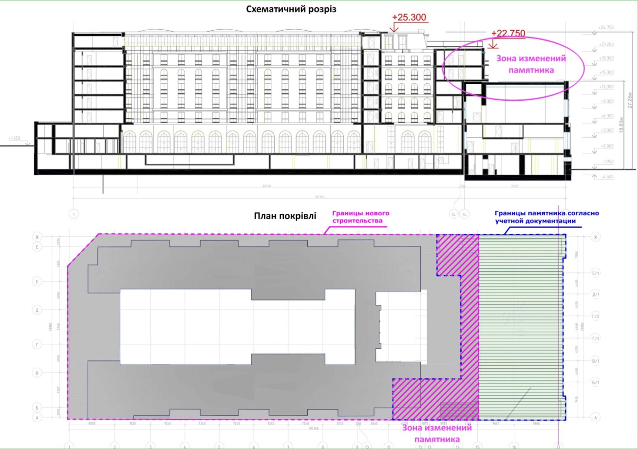 В своем решении проектировщики опираются на Режимы использования исторических ареалов в составе ИАОП: «У Центральному історичному ареалі гранична висота нових будівель і споруд, що виходять на червоні лінії вулиць, не повинна перевищувати 18,6 м від рівня денної поверхні, а висота акцентних будівель на розі кварталів – не вище 21.3 м. Гранична висота нових будівель, які розміщуються у глибині кварталів, має визначатися математичними розрахунками у складі історико-містобудівних обгрунтувань таким чином, щоб видима з вулиці проекція верхньої частини фасаду нової будівлі за висотою становила не більше ніж 62% фасаду будівлі, яка виходить на червону лінію вулиці».